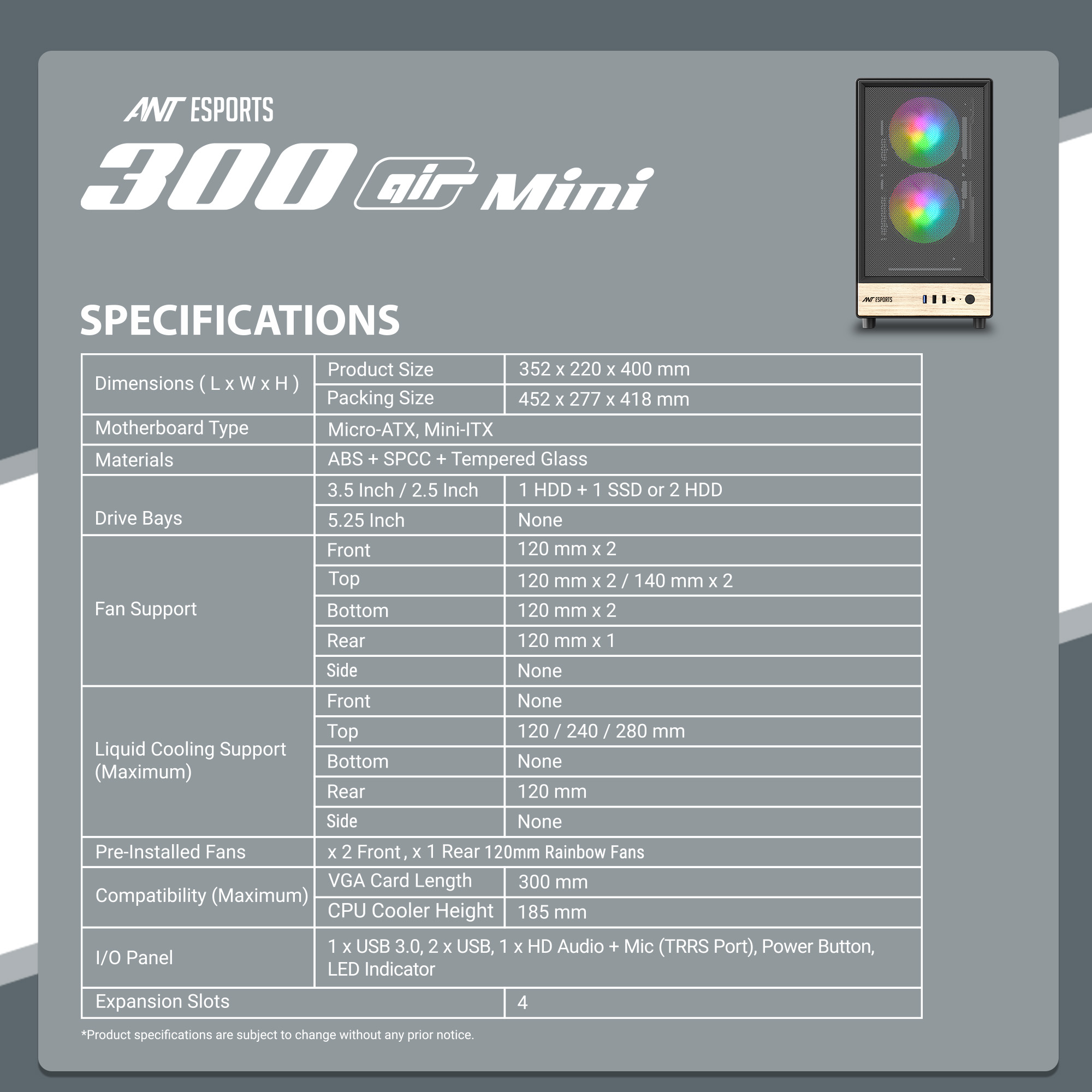 The Ant Esports 300 Air Mini redefines small form factor PC builds with an elegant, airflow-optimized design and versatile compatibility. Built for gamers, creators, and professionals who value performance without compromise, this Micro-ATX case blends premium materials, exceptional ventilation, and modern aesthetics into one compact powerhouse.