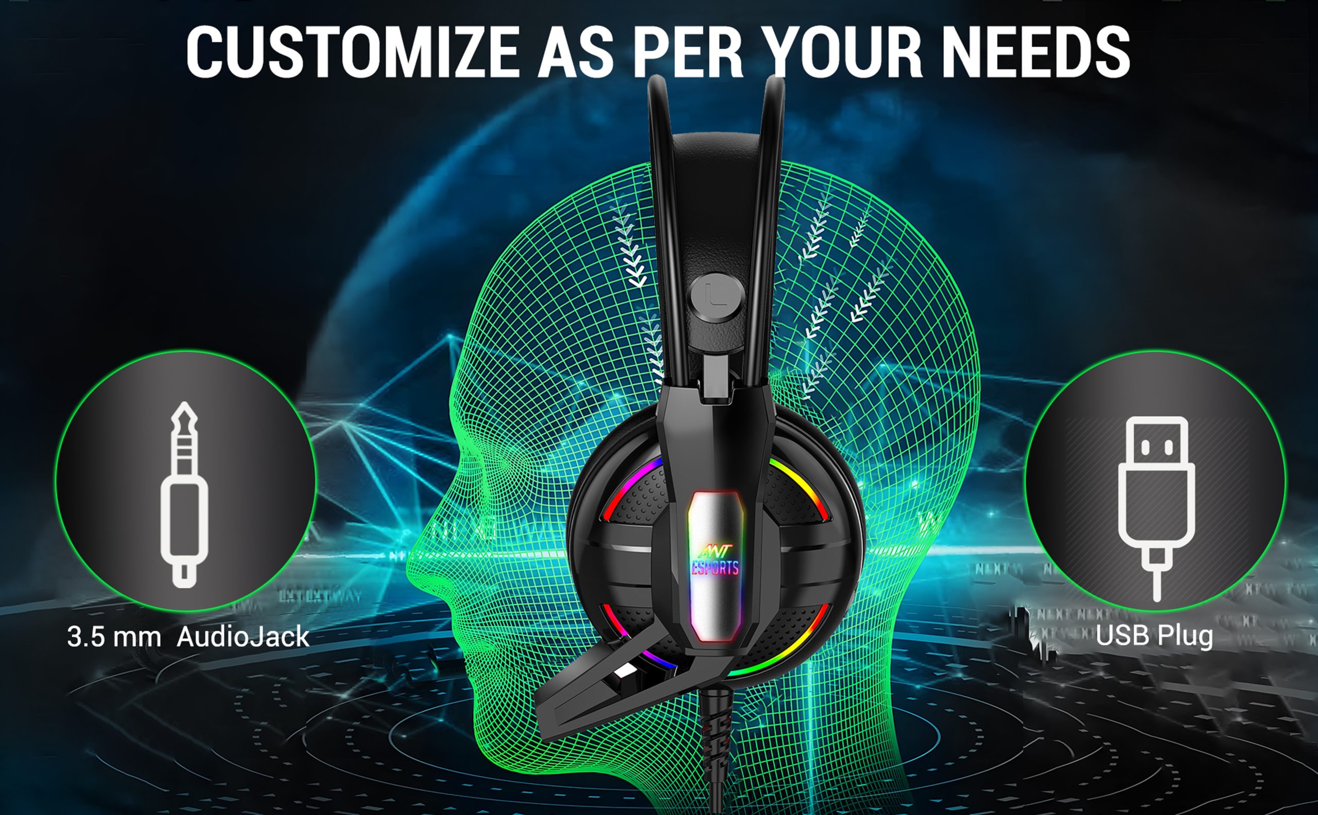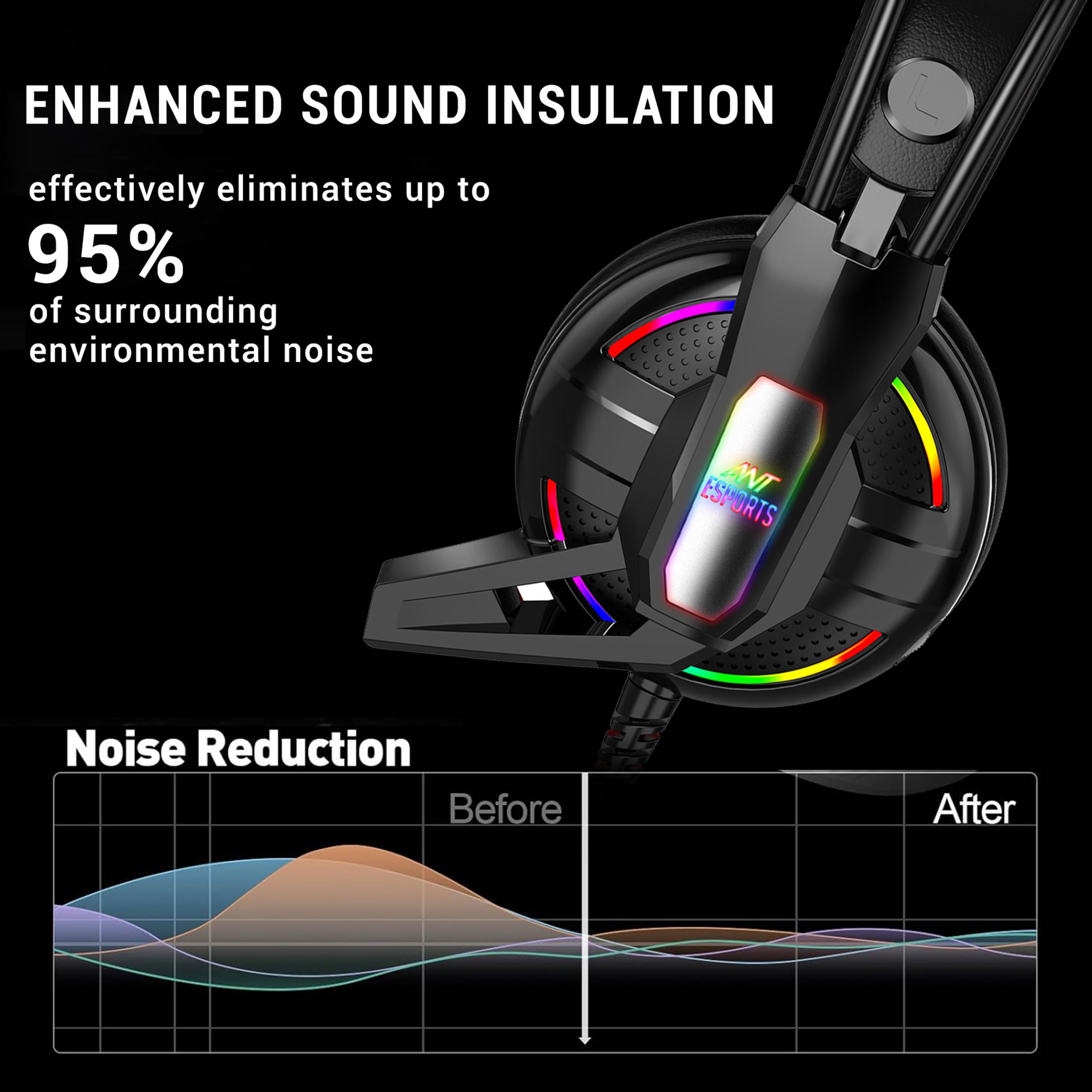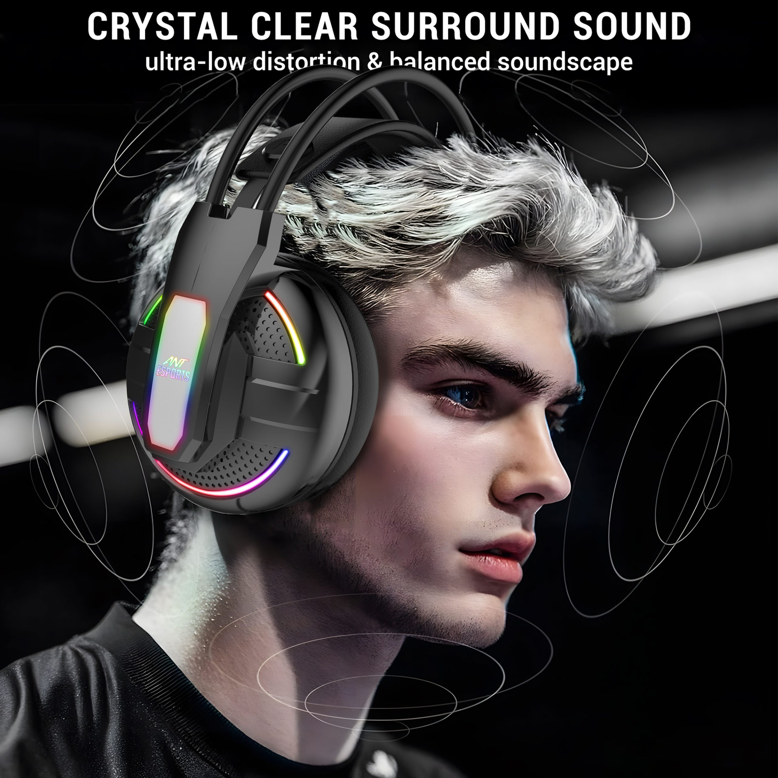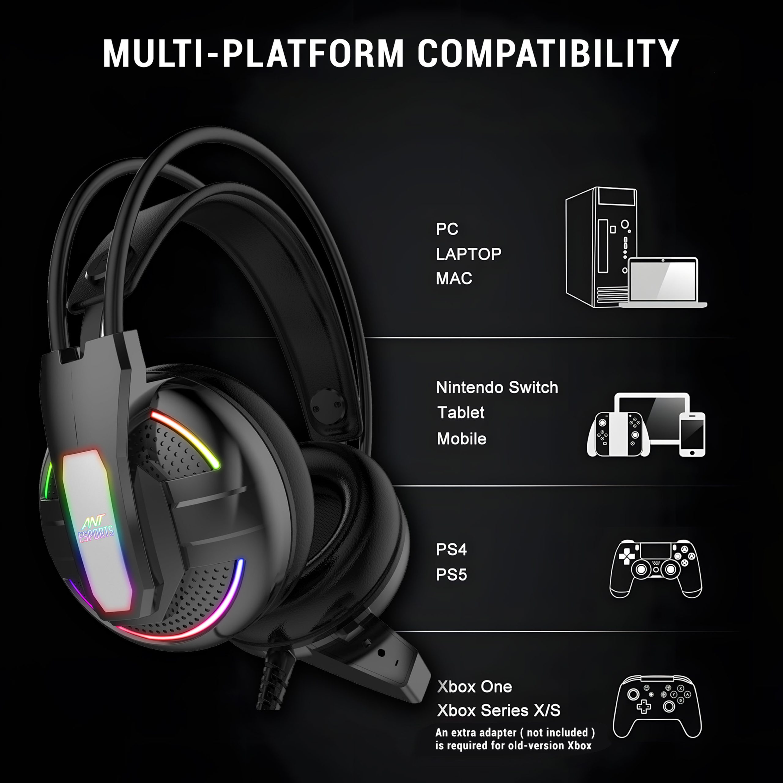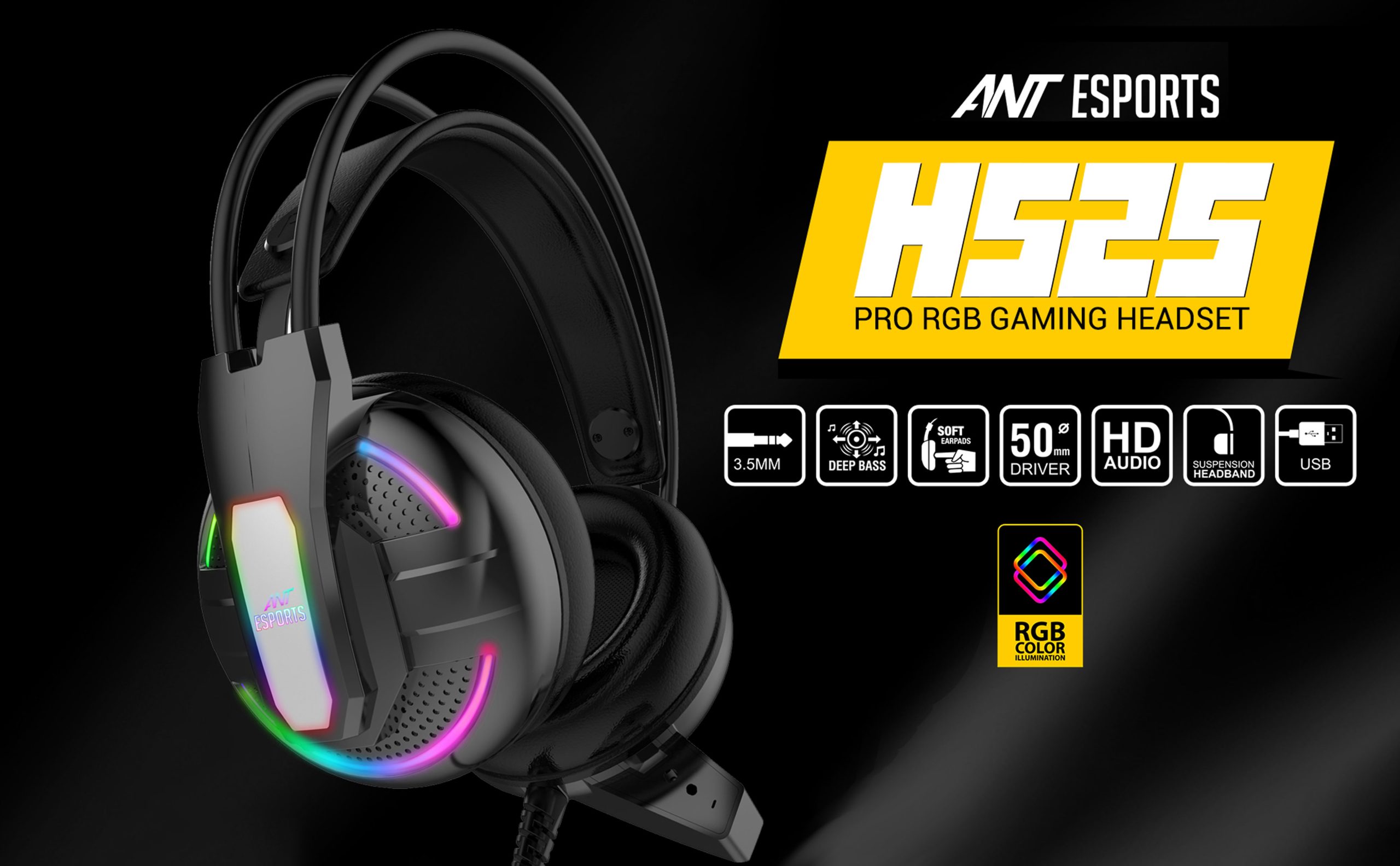 Ant Esports H525 Pro RGB Gaming Headset Gaming Over Ear Wired Headphones with Mic| 2 * 3.5MM Jack + USB for RGB Light |50 MM Drivers | Compatible with PC/ PS4/Xbox One/Nintendo/Mobile_Black
