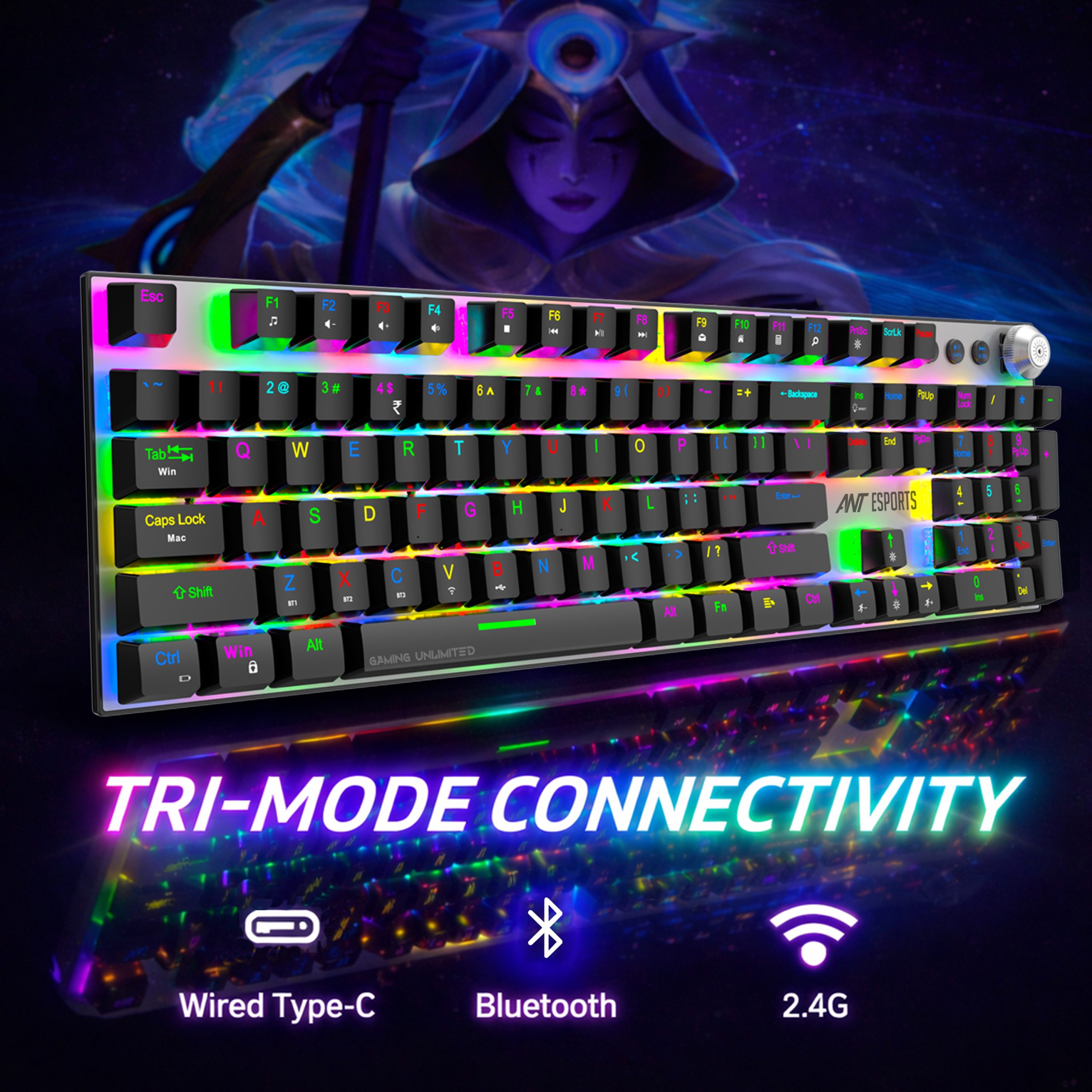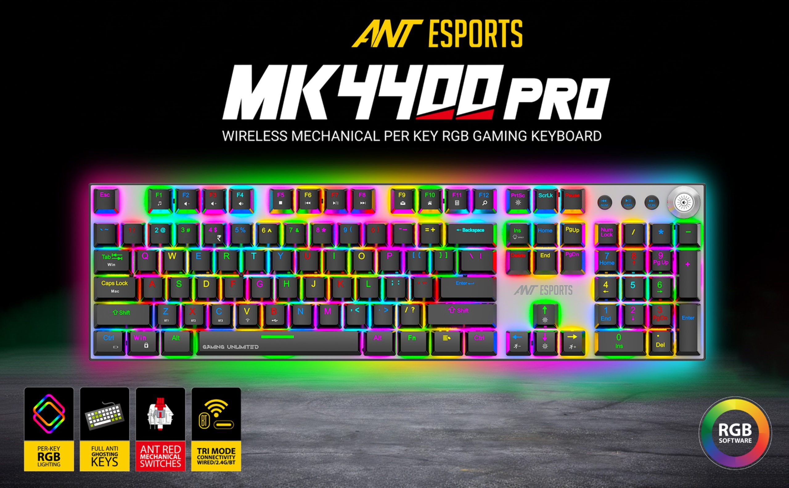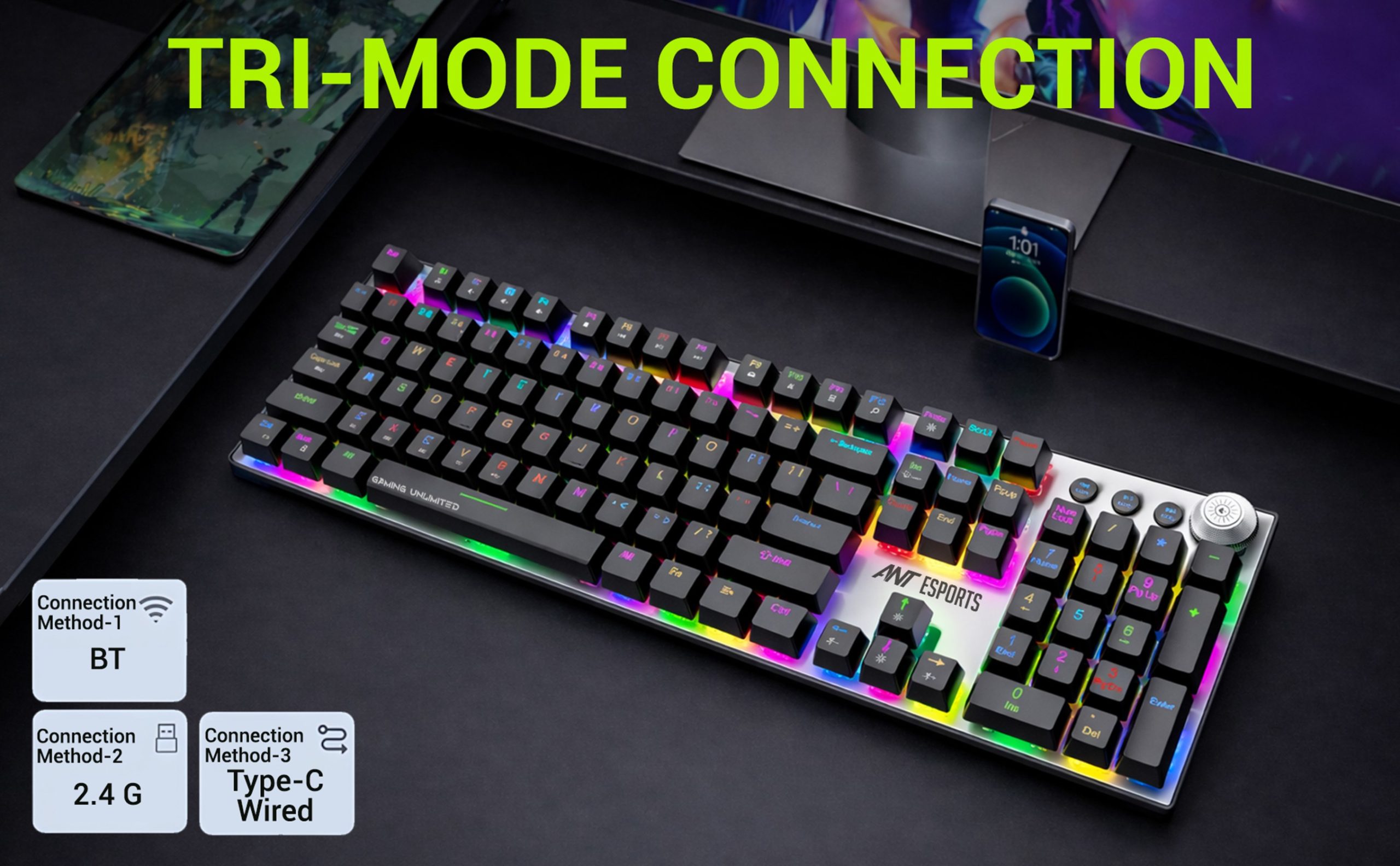 The ANT Esports MK4400 Pro Wireless Mechanical Per-Key RGB Gaming Keyboard is a full-size 104-key mechanical keyboard engineered for high-performance gaming and professional productivity. Featuring tri-mode connectivity—Bluetooth, 2.4GHz wireless, and USB Type-C wired—it ensures seamless compatibility across Windows, macOS, Linux, and Android devices.