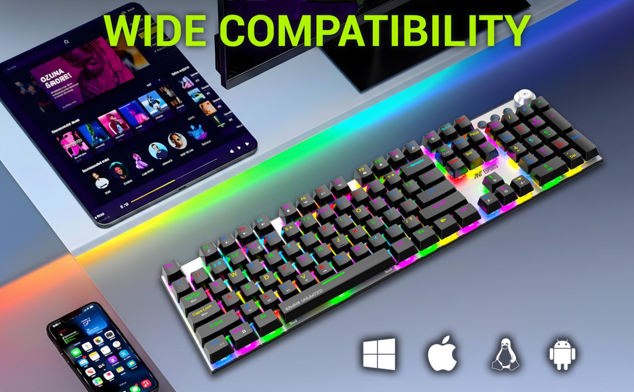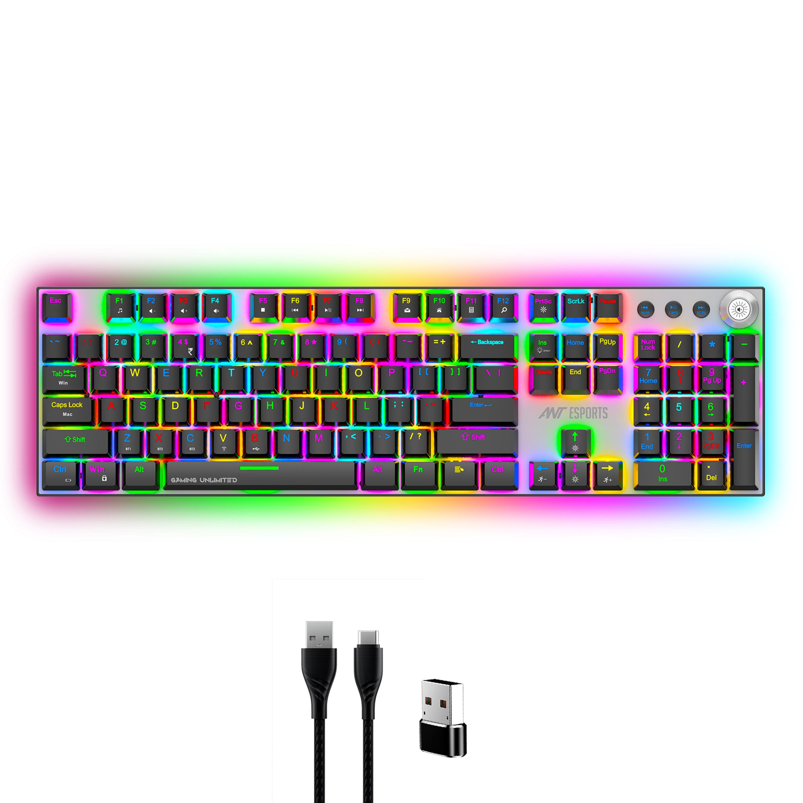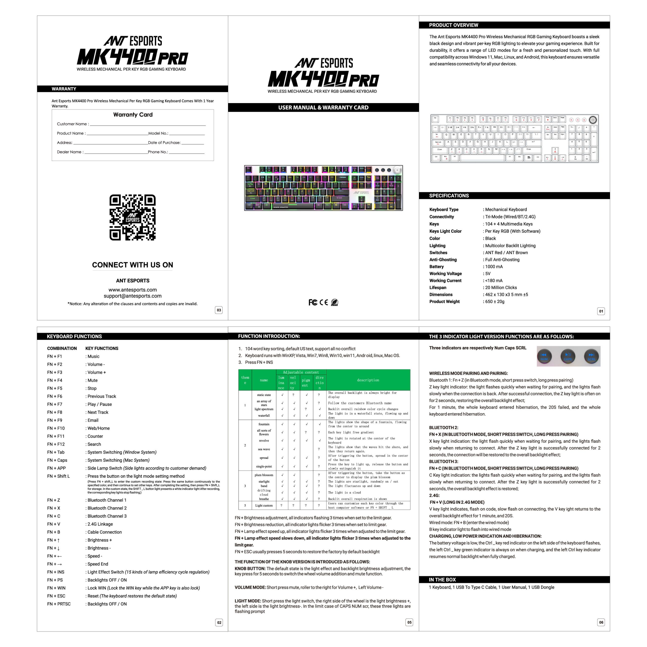 The ANT Esports MK4400 Pro Wireless Mechanical Per-Key RGB Gaming Keyboard is a full-size 104-key mechanical keyboard engineered for high-performance gaming and professional productivity. Featuring tri-mode connectivity—Bluetooth, 2.4GHz wireless, and USB Type-C wired—it ensures seamless compatibility across Windows, macOS, Linux, and Android devices.