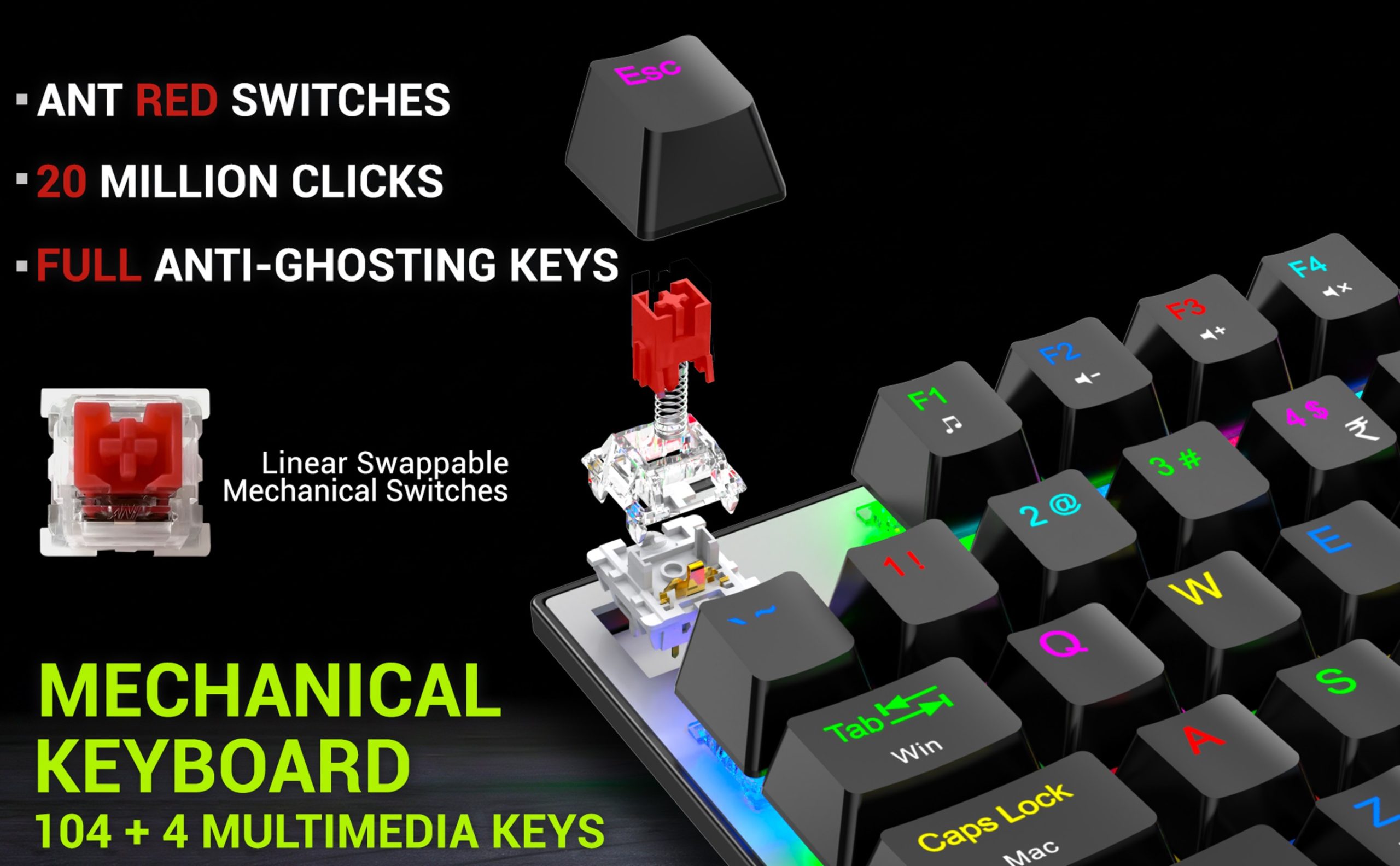 Built with durable ANT mechanical red switches, the MK4400 Pro delivers precise actuation and a lifespan of up to 20 million keystrokes. Full anti-ghosting support guarantees accurate input registration, even during fast-paced gaming sessions.
