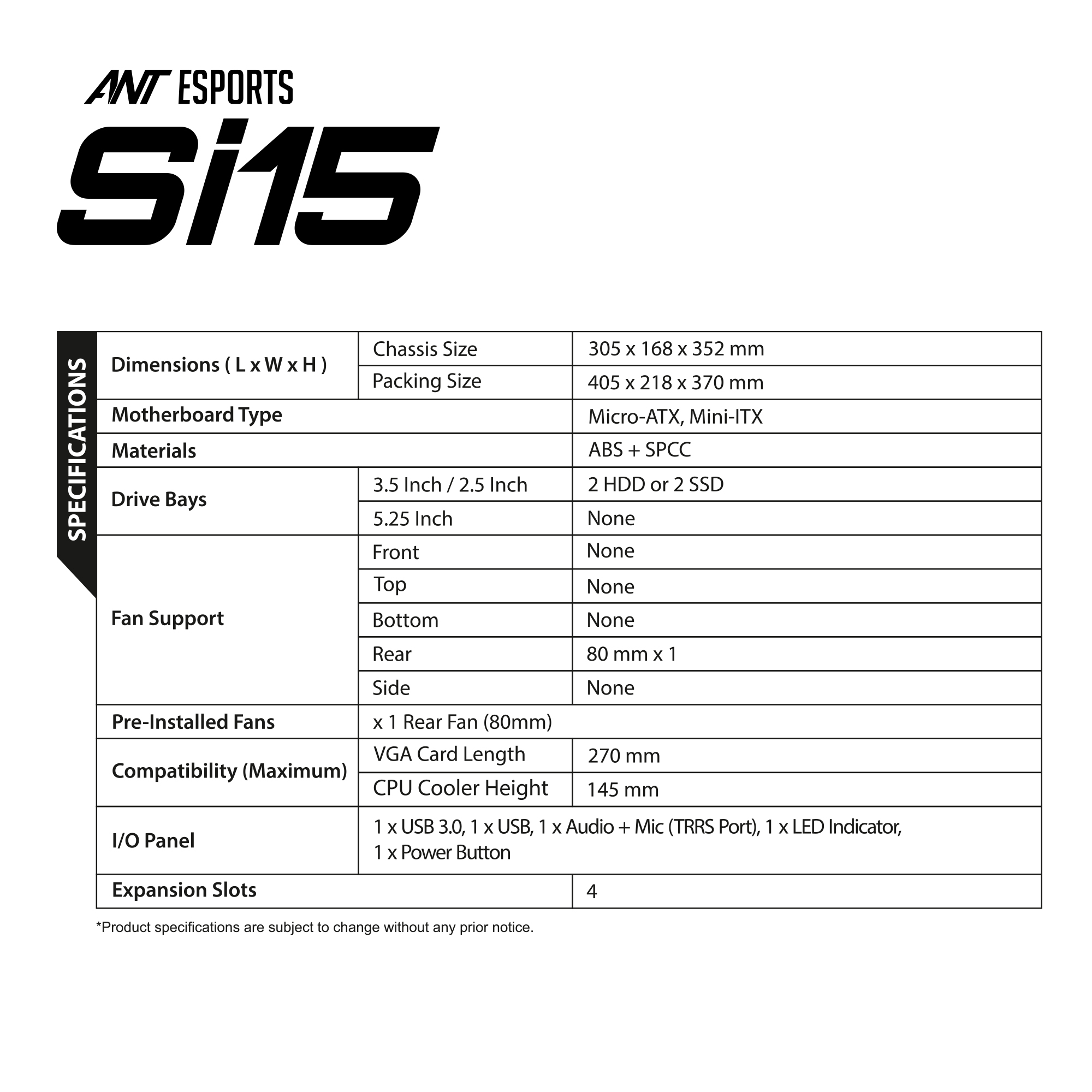 The Ant Esports SI15 is a compact mini tower cabinet designed for efficient and reliable PC builds. Ideal for home, office, and entry-level gaming systems, it supports Micro-ATX and Mini-ITX motherboards while maintaining a minimal footprint.