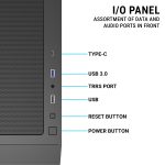 Modern Front I/O Panel – Features USB 3.0, dual USB 2.0, audio ports, and RGB control for easy access and customization.