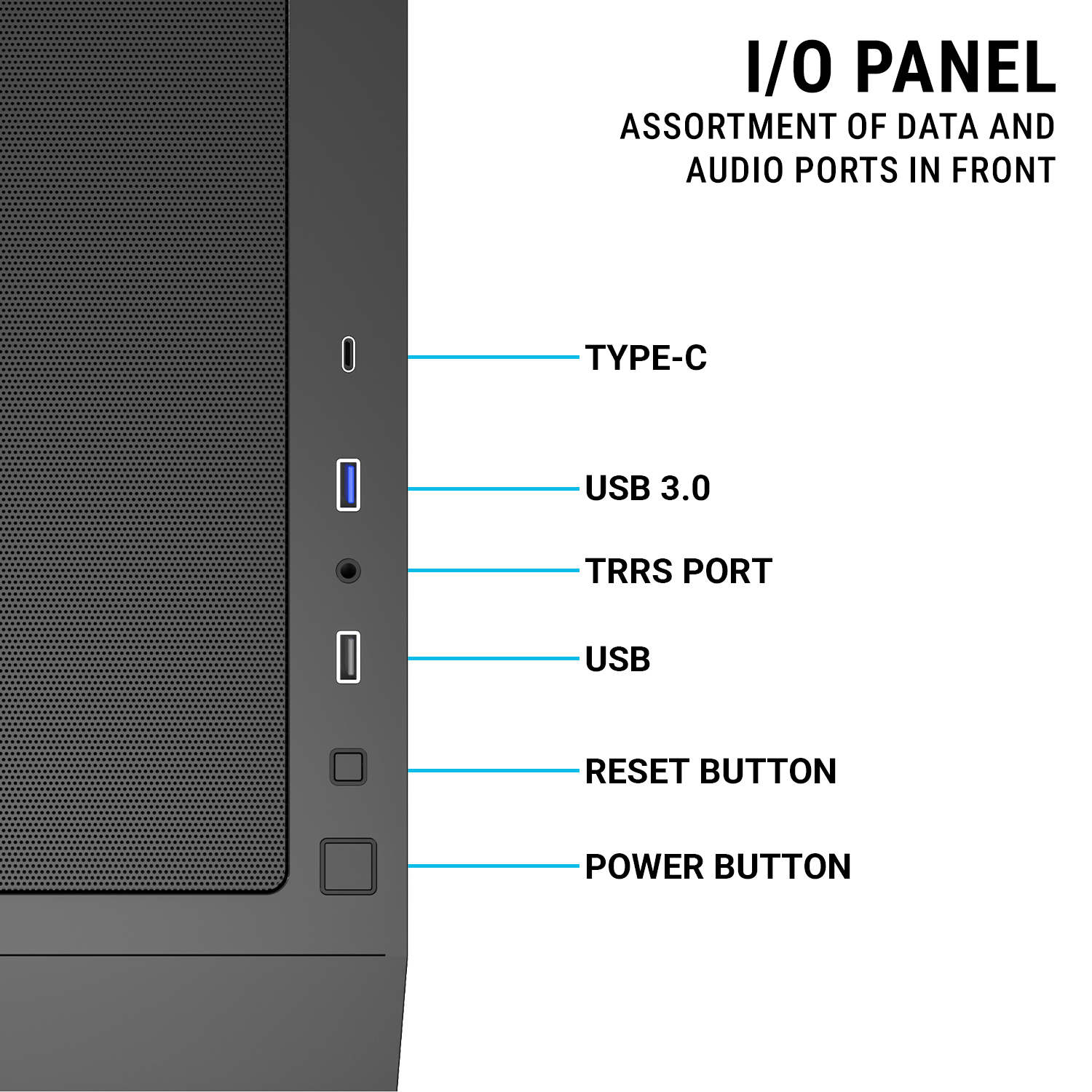 Convenient Front I/O Panel – Features USB 3.0, dual USB 2.0, audio & mic ports, plus power and reset buttons for easy access.