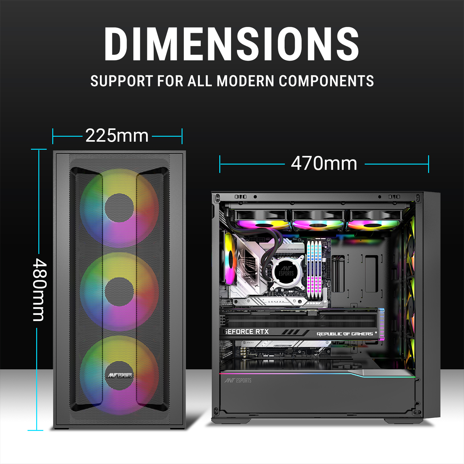 Premium Glass Front & Side Panels – Stylish dual tempered glass design to display your components and RGB lighting setup.