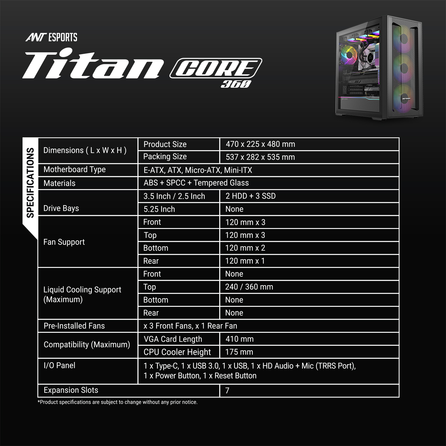 The ANT Esports Titan Core 360 is a spacious mid-tower gaming case.Supports E-ATX, ATX, Micro-ATX, and Mini-ITX motherboards.Includes 2 HDD and 3 SSD drive bays for versatile storage.Pre-installed 3 front and 1 rear 120 mm fans with top 240/360 mm liquid cooling support.Front I/O features USB Type-C, USB 3.0, HD Audio & Mic, Power and Reset buttons.