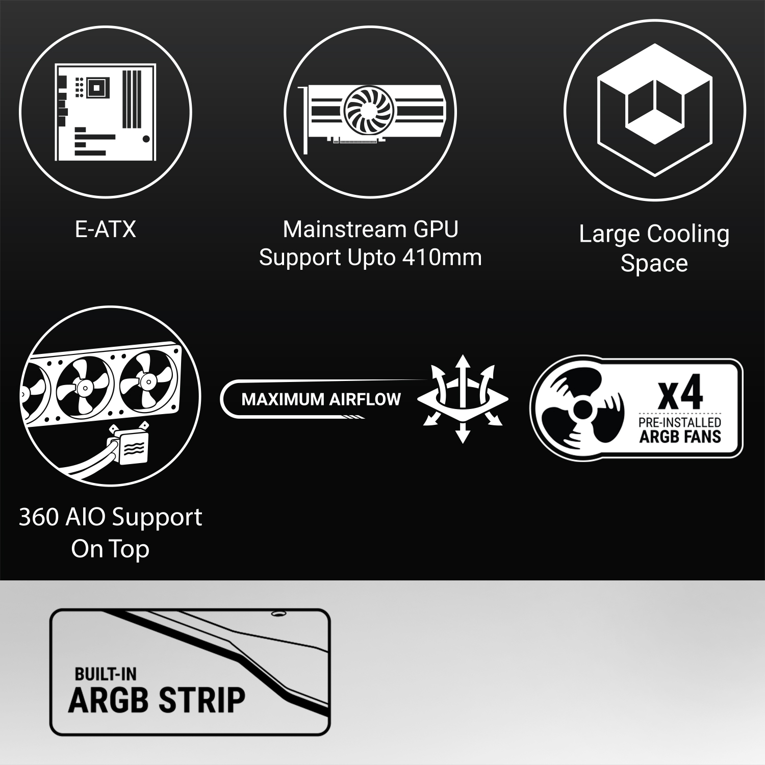 Versatile Cooling Support – Supports up to eight fans and liquid cooling radiators up to 360mm in front and top, ensuring superior temperature management for high-performance builds.