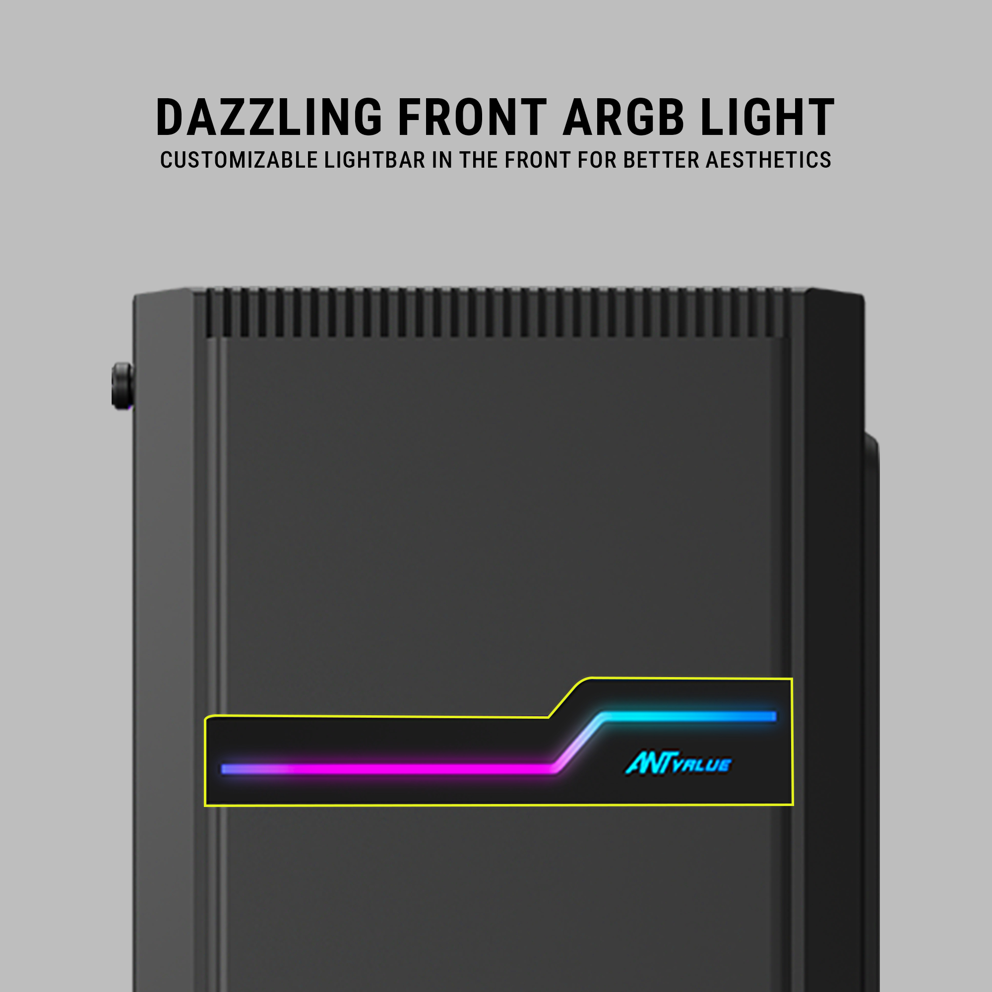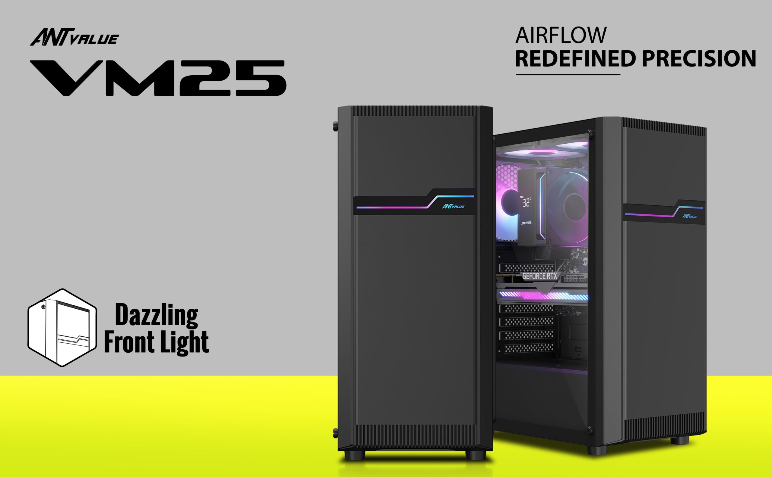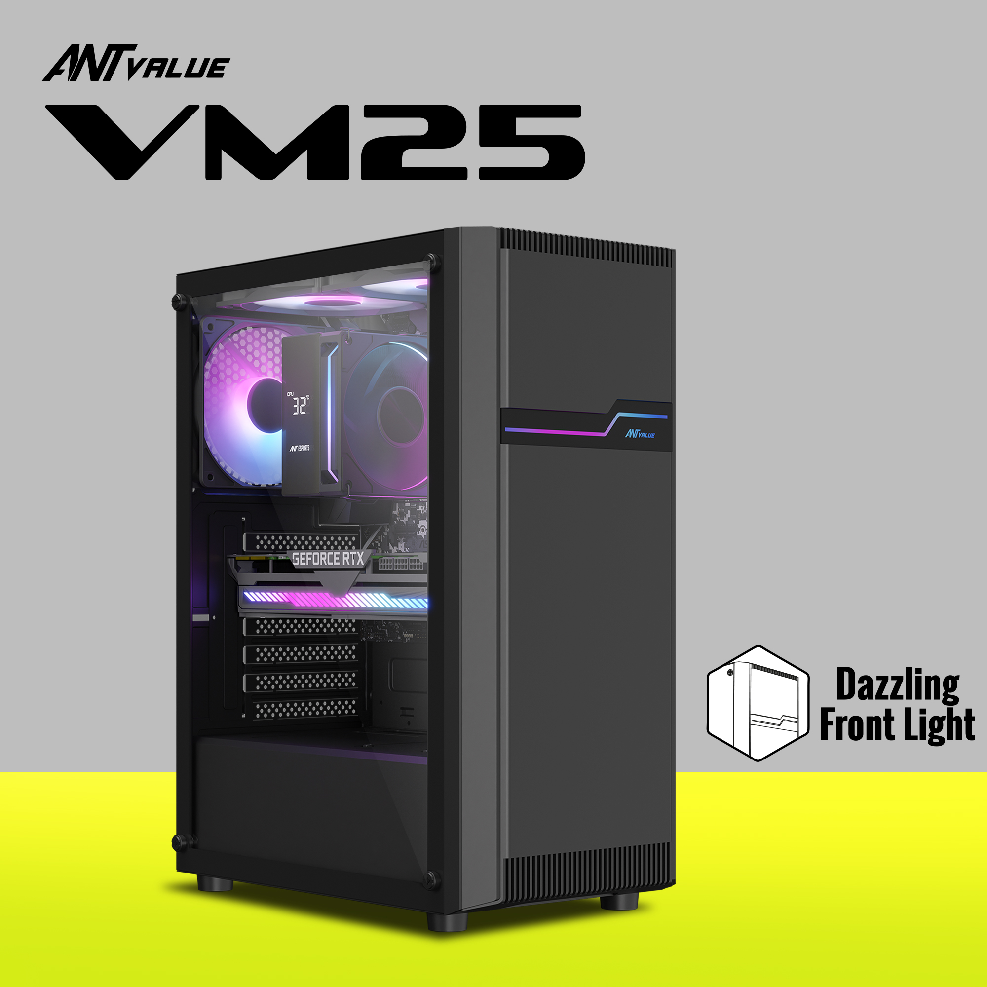 The ANTVALUE VM25 is a mid-tower cabinet crafted for users seeking a balance between aesthetics and functionality. Featuring a sleek front panel with a vibrant RGB light strip and a tempered glass side panel, it delivers a modern look suitable for gaming and professional setups alike.