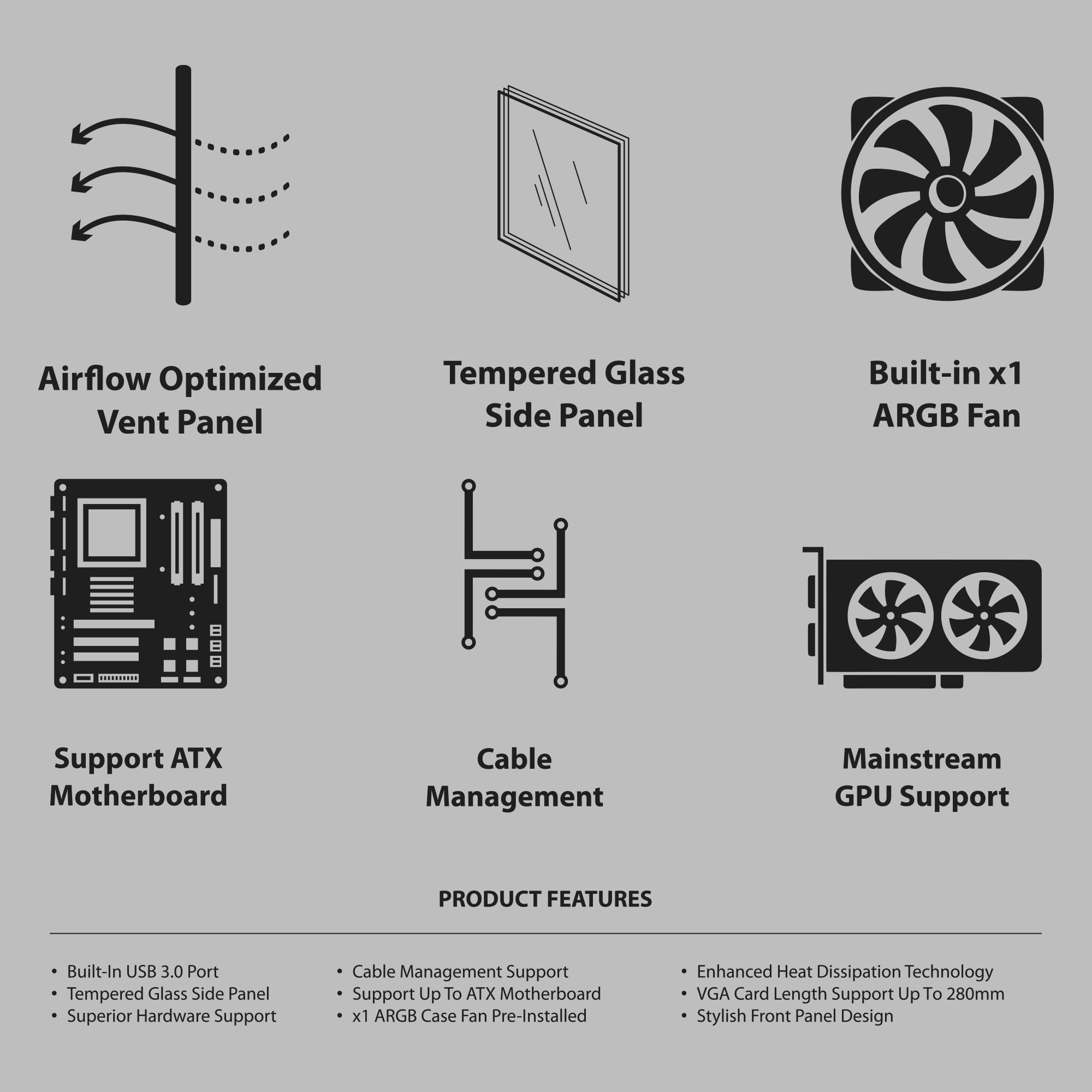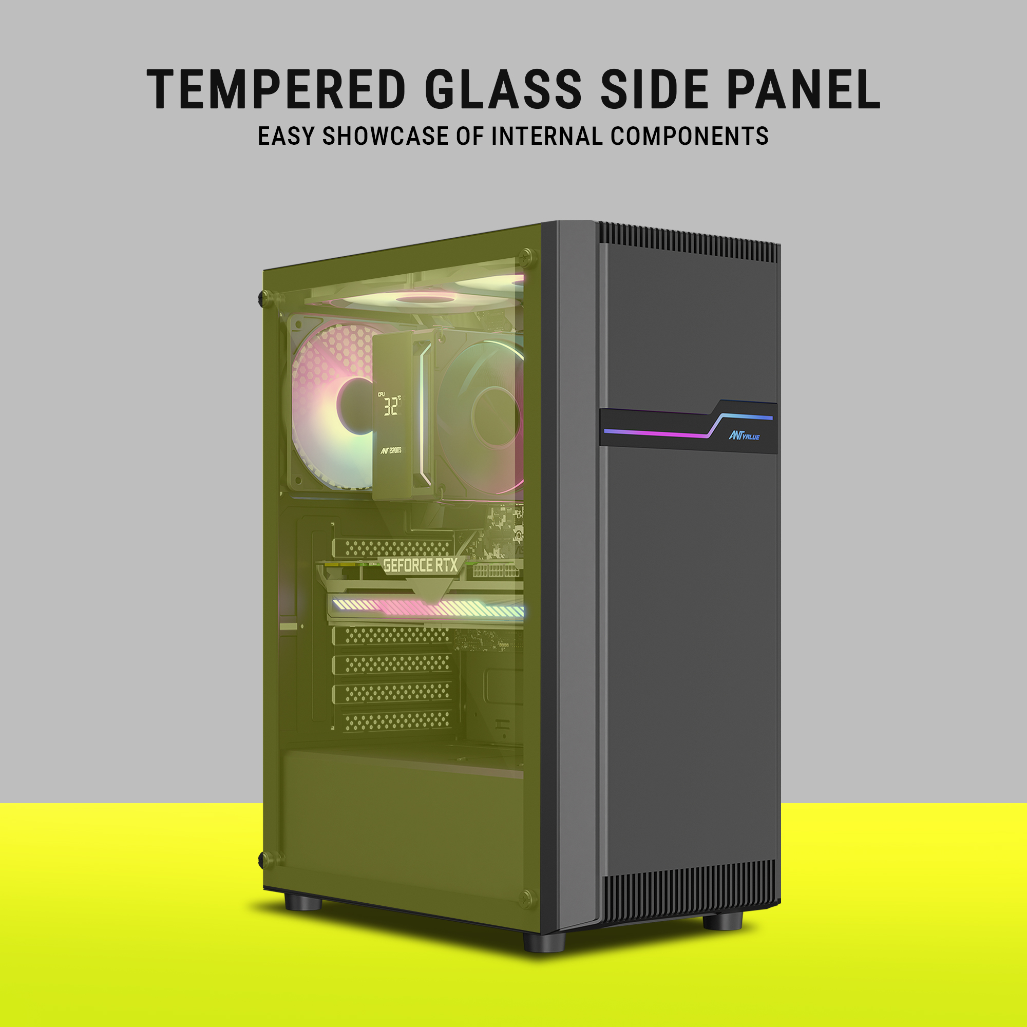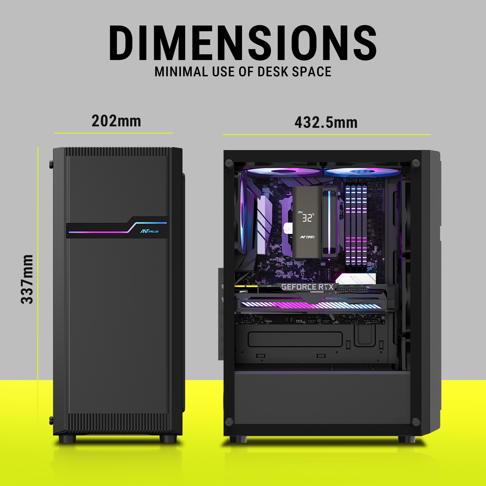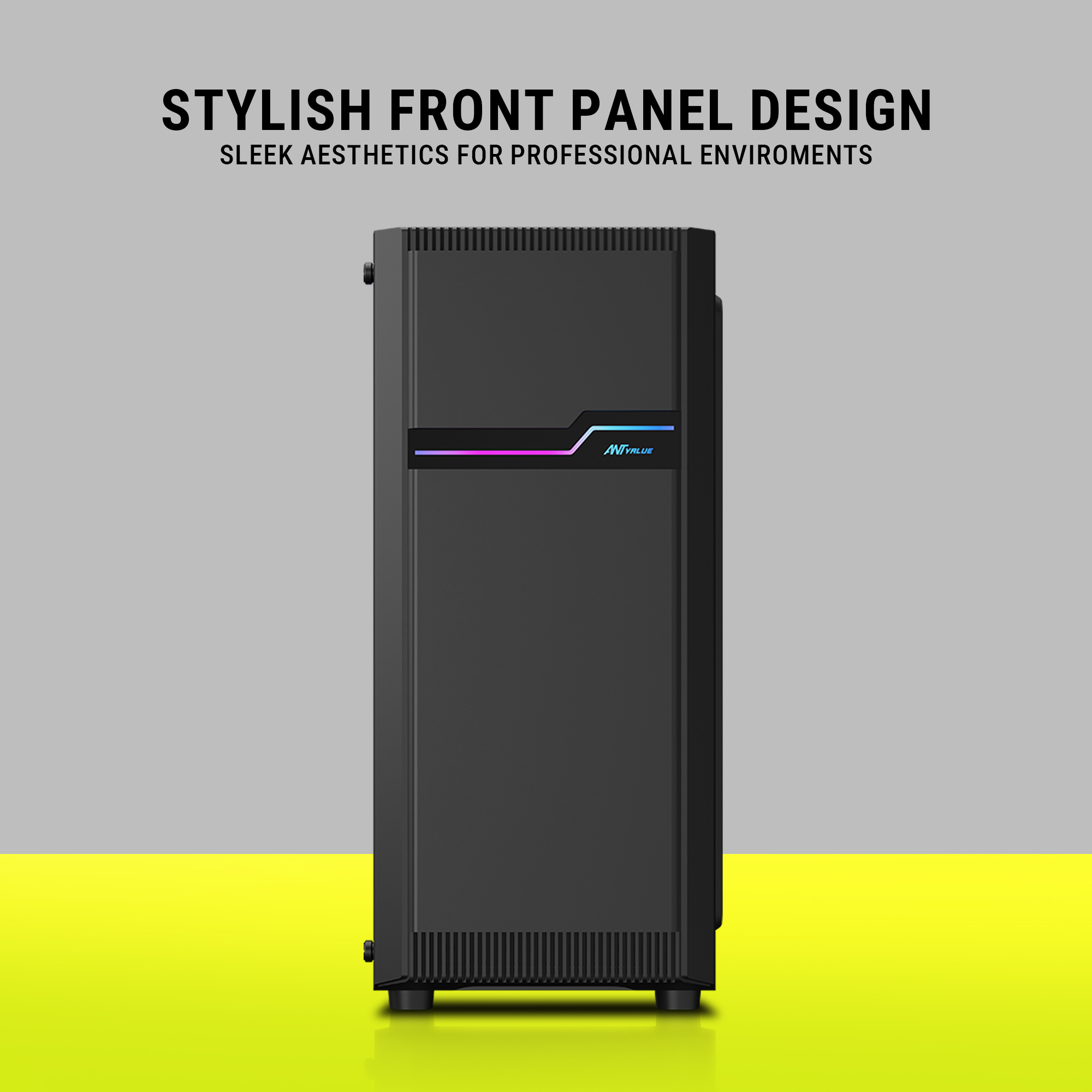 The ANTVALUE VM25 is a mid-tower cabinet crafted for users seeking a balance between aesthetics and functionality. Featuring a sleek front panel with a vibrant RGB light strip and a tempered glass side panel, it delivers a modern look suitable for gaming and professional setups alike.