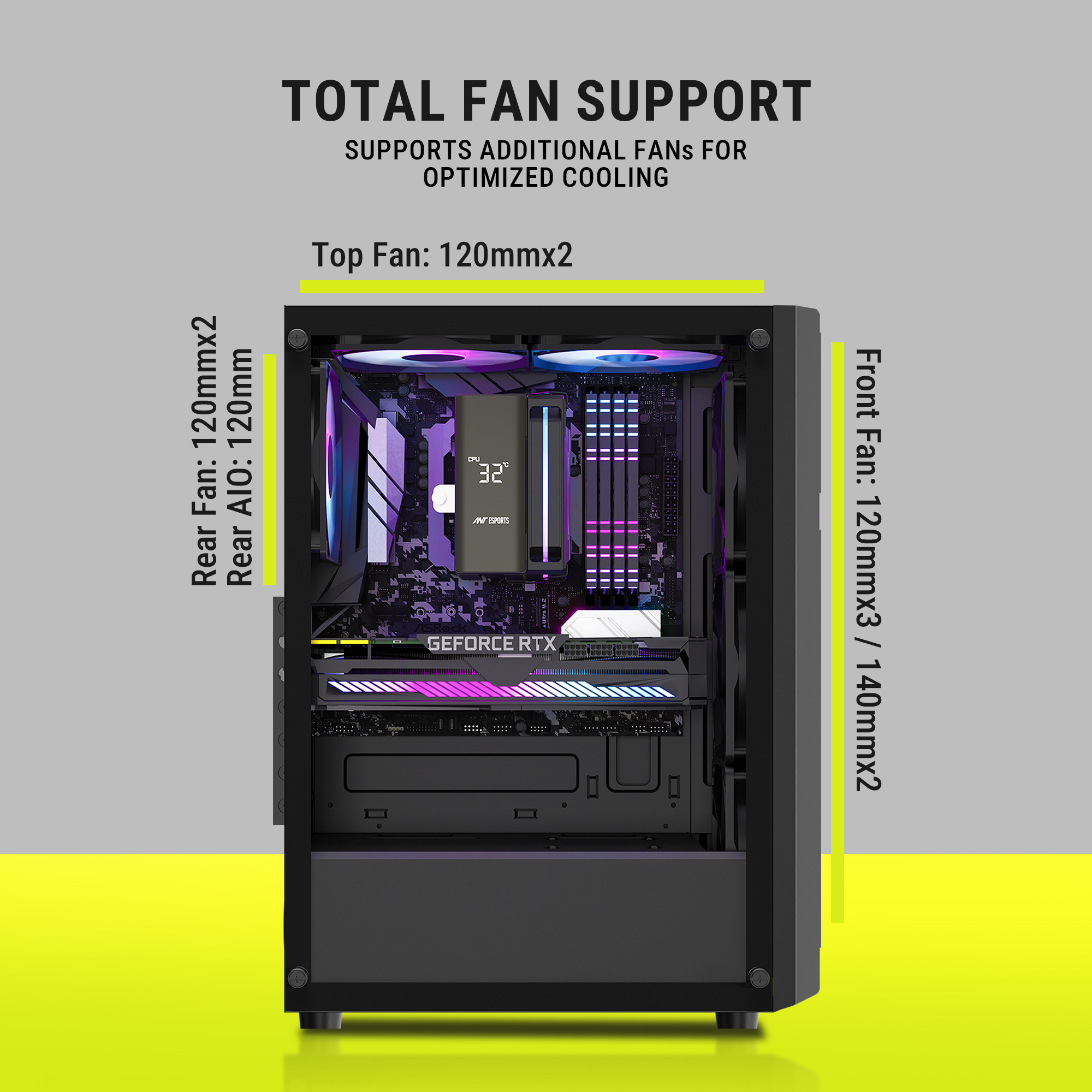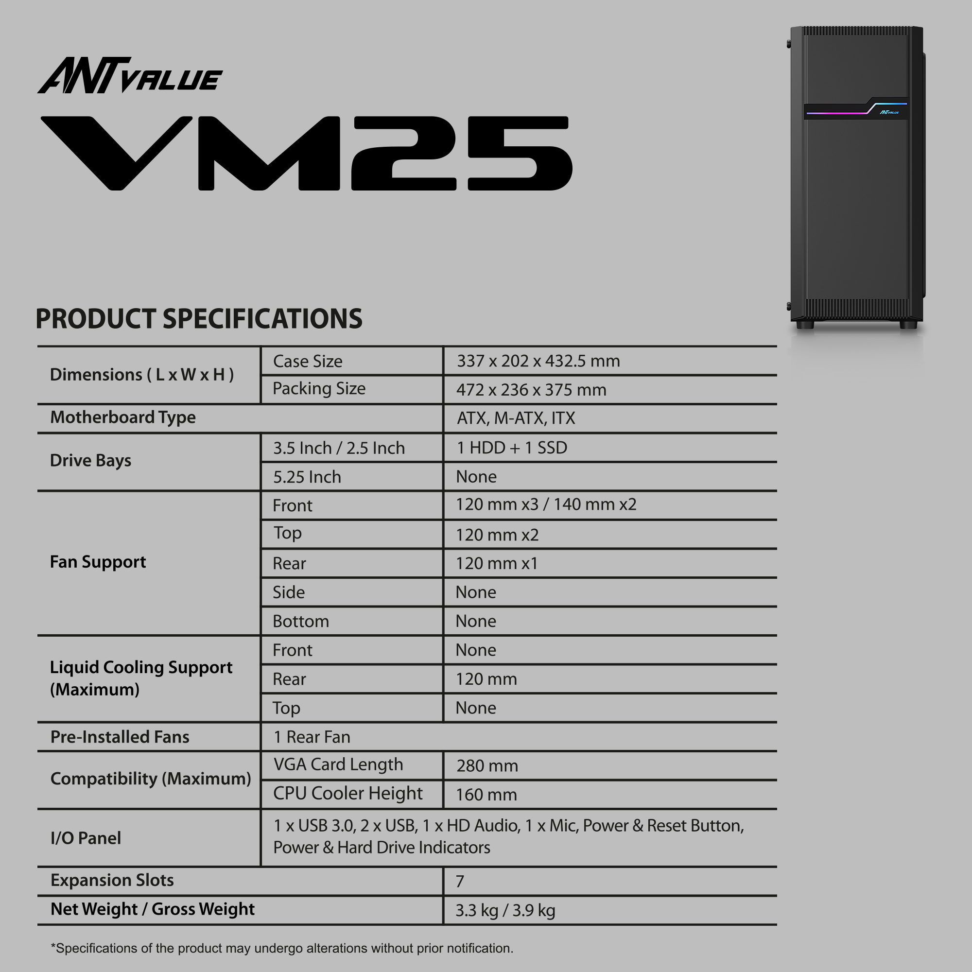 Designed to support ATX, Micro-ATX, and Mini-ITX motherboards, the VM25 ensures versatile build compatibility. It accommodates up to three 120mm or two 140mm front fans, two 120mm top fans, and one 120mm rear fan (pre-installed), enabling effective airflow management.