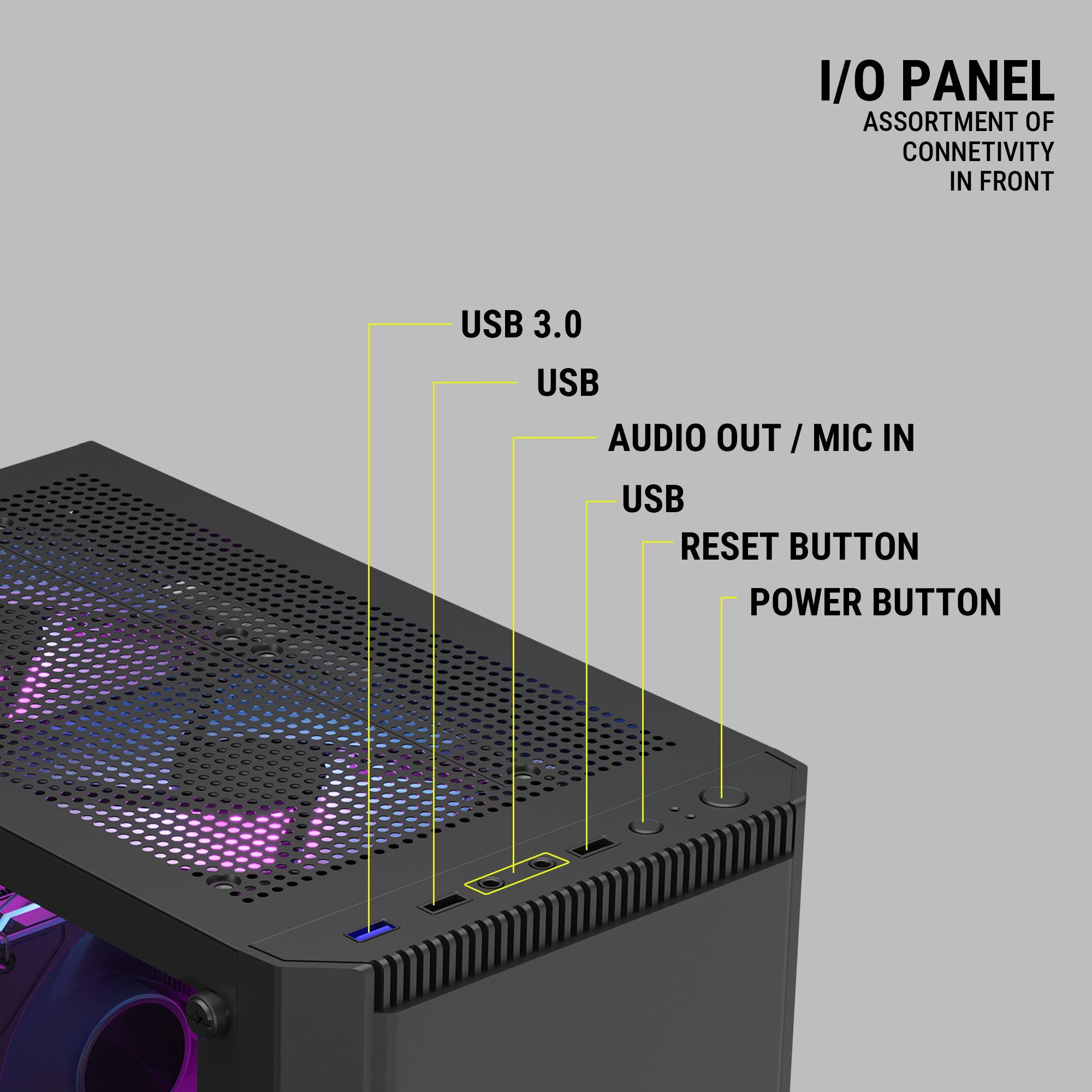 • Easy-Access Front I/O PanelFront-mounted ports and controls provide quick access for USB devices, audio connectivity, and power functions.