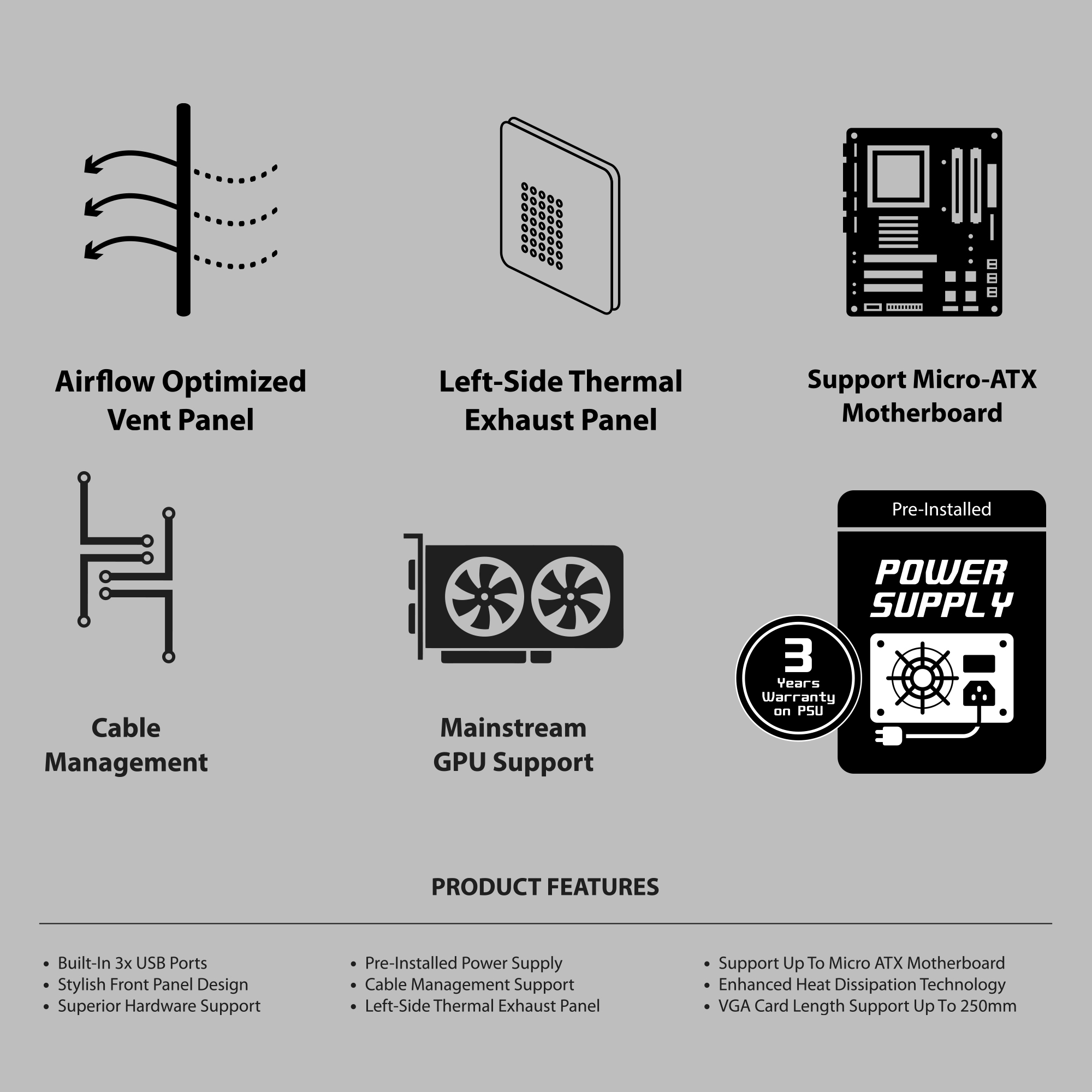 Supporting Micro-ATX and ITX motherboards, the VM5P offers compatibility with GPUs up to 250 mm and CPU coolers up to 140 mm, making it ideal for mainstream performance systems. The cabinet includes a pre-installed ATX power supply, significantly reducing build time and simplifying system assembly.