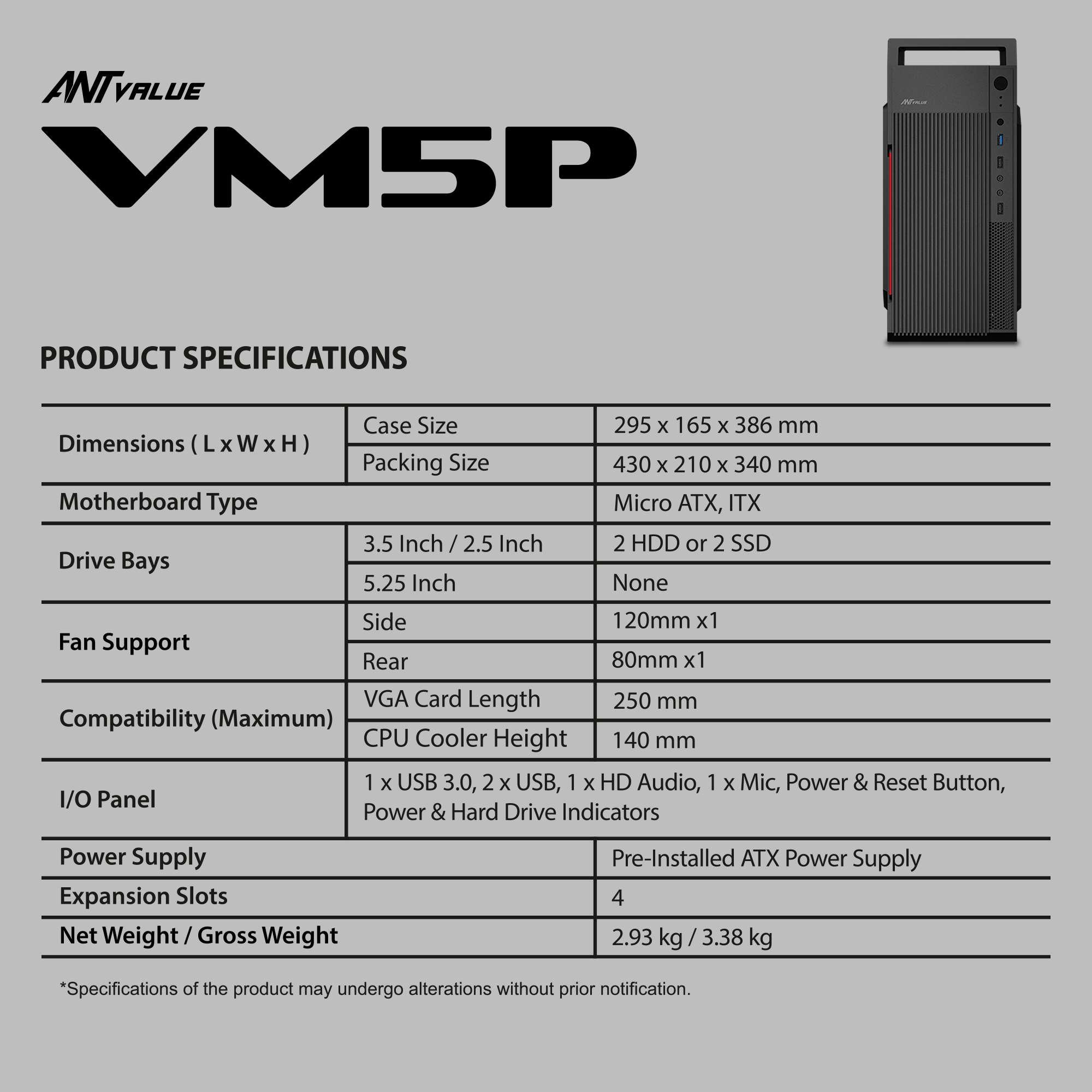 With a lightweight yet sturdy build and a well-equipped front I/O panel, the ANT VALUE VM5P is the perfect balance of compact design, functionality, and performance-ready engineering.