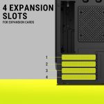 Efficient cooling is achieved through side support for a 120mm fan and a rear 80mm exhaust fan, ensuring consistent airflow throughout the system. Storage flexibility is provided with support for up to two HDDs or SSDs, while four expansion slots allow for future upgrades.